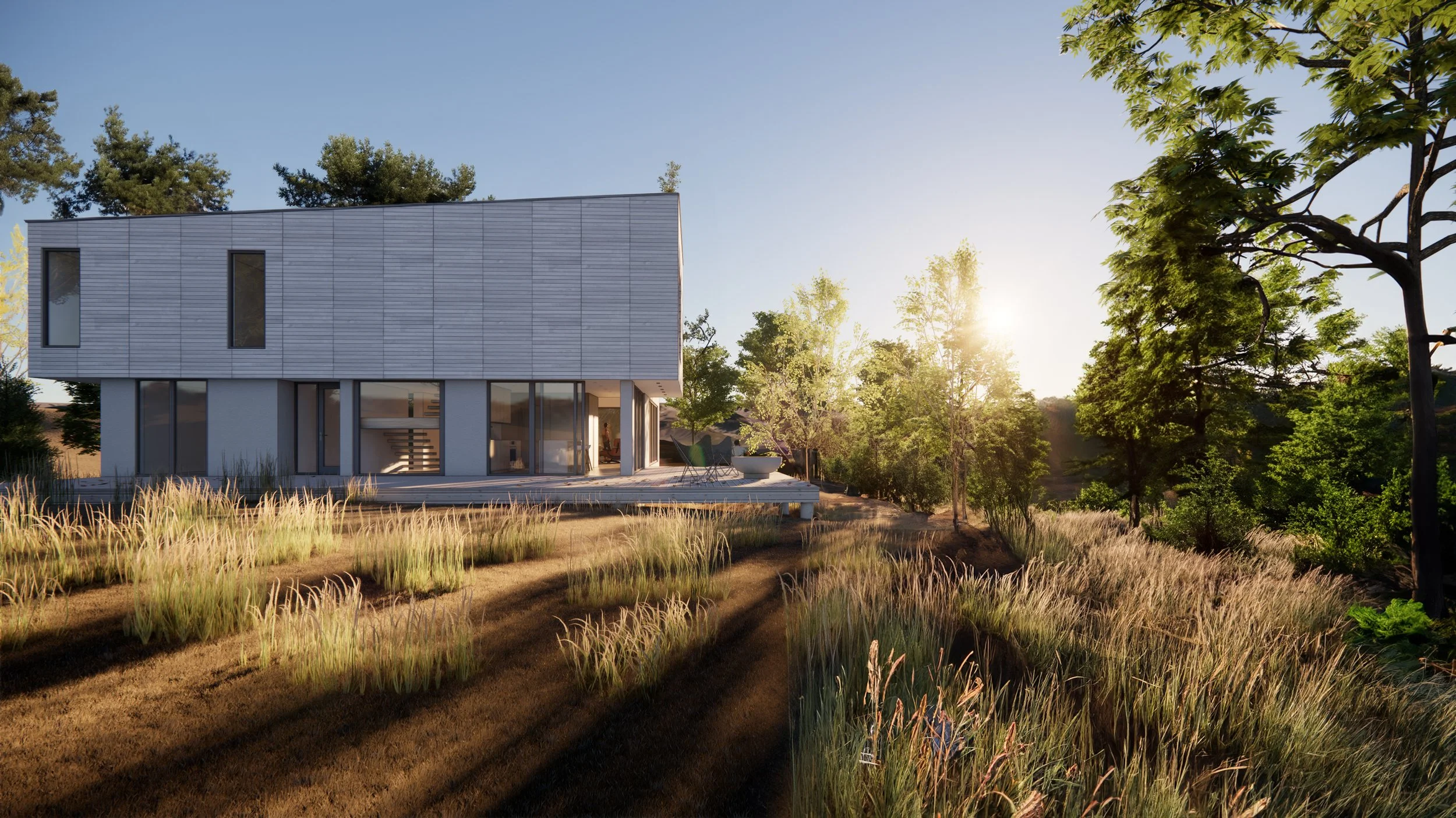 The secluded location in Columbia Country, NY is a chance to live in the woods. A wandering path from the road winds through the mature forest before ending at the top of the overlook. Selective clearing offers distant views of the Berkshire mountains to the east and natural light to the south.