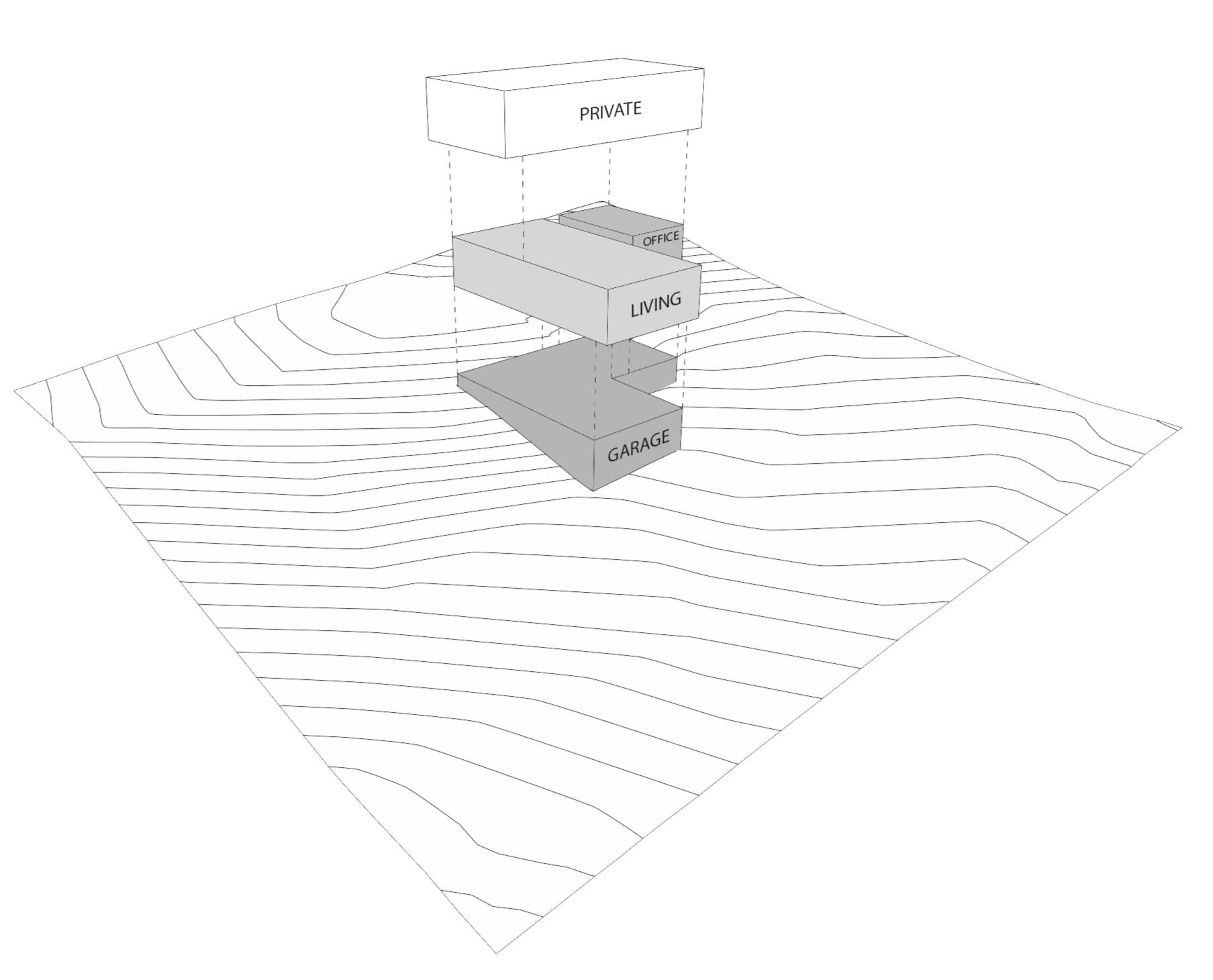 It is important to limit the amount of cut and fill to leave the site as undisturbed as possible. By stacking the 2 story home above the garage the footprint is minimized while taking advantage of the natural topography for building access.